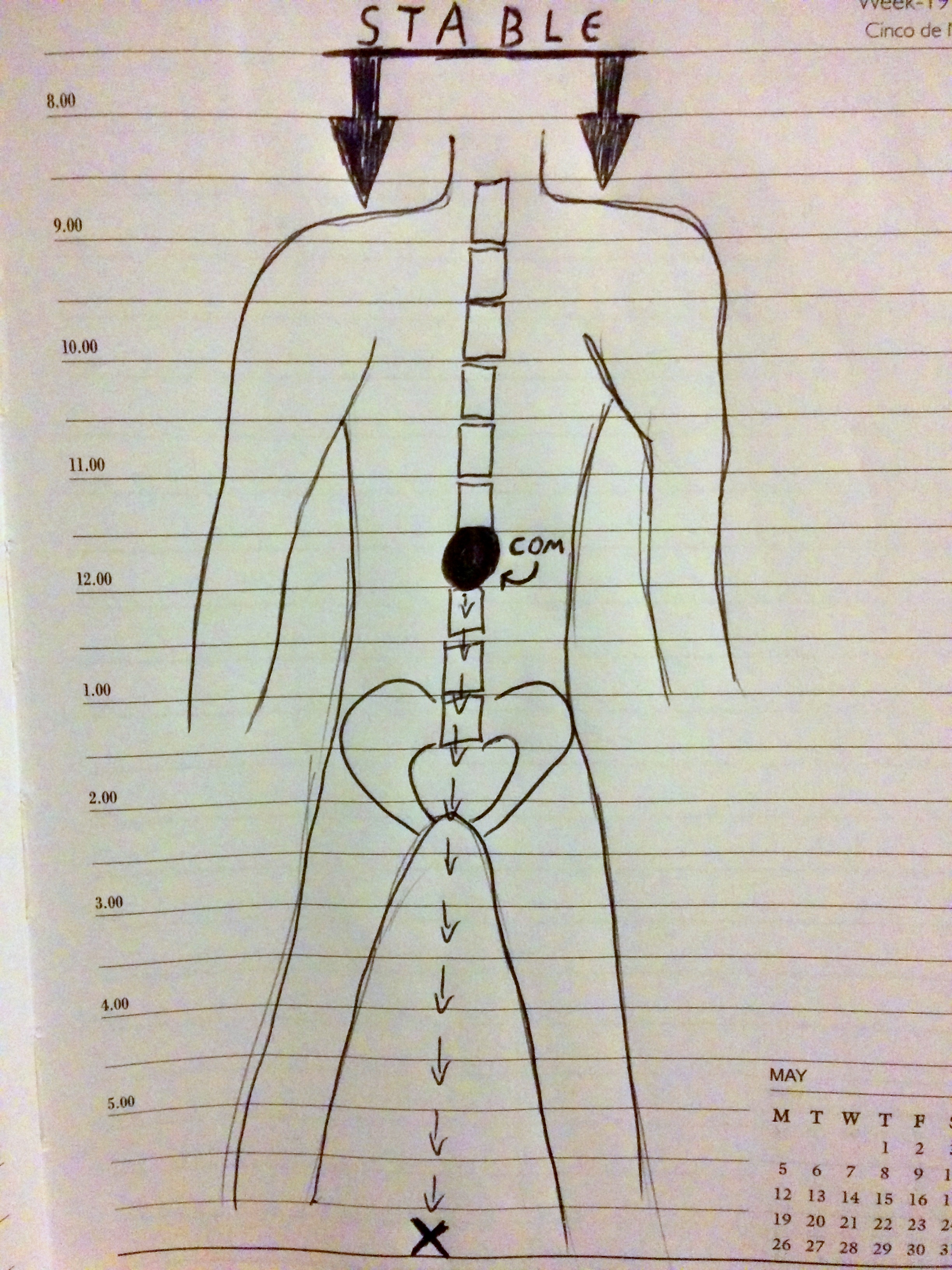 As we saw with our partners, applying a downward force to a straight spine doesn’t really do much to their posture. A straight, neutral stance is of course very stable as your COM’s reference point (marked X on my scribbles) is right between your feet along your centre line. (Wing Chun people are nodding sagely…)