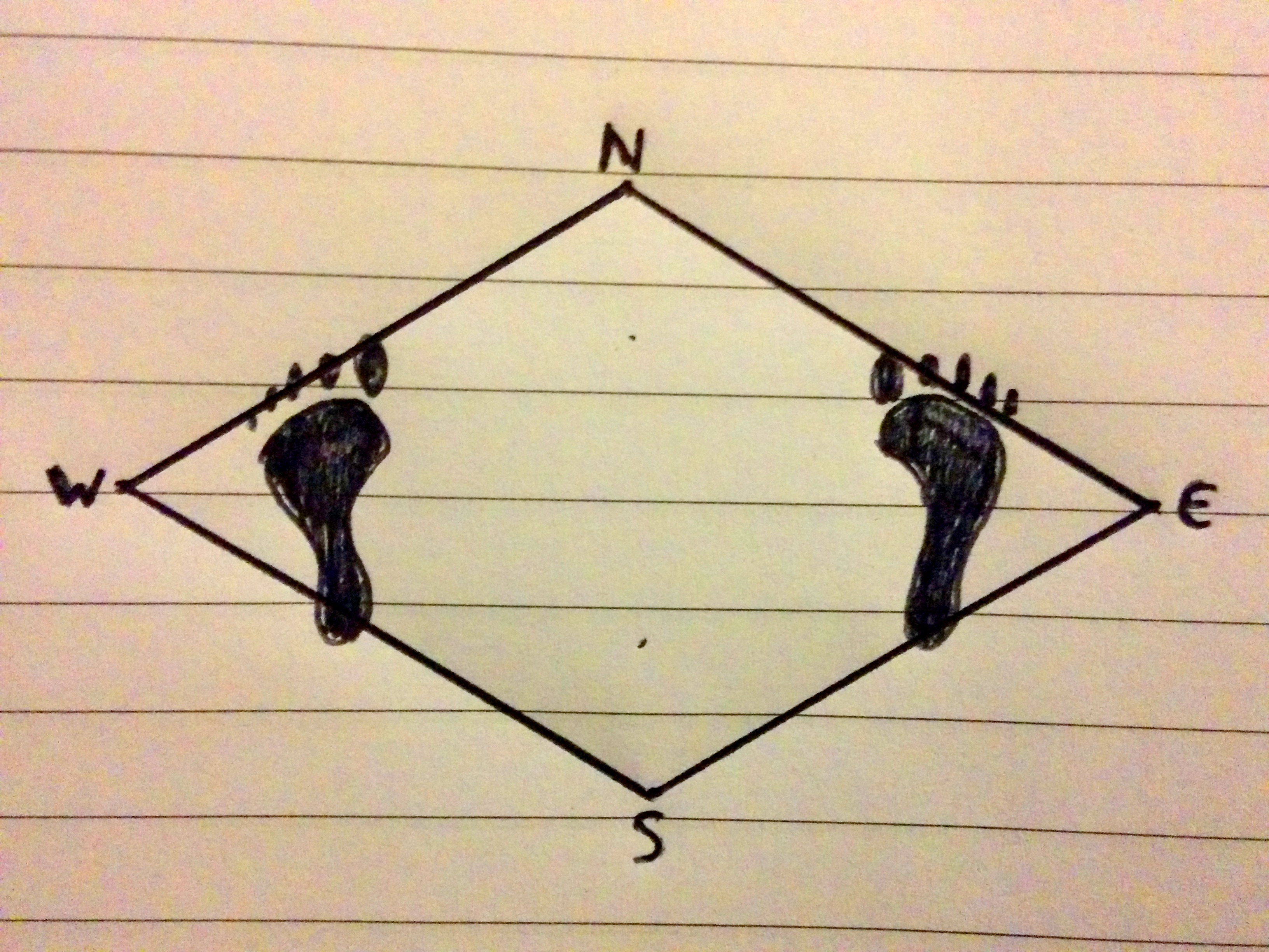 As the point on the floor directly below a person’s COM (reference point marked x on the above scribblings) is moved in any direction away from the centre, the posture of the person is weakened and their ability to withstand downwards pressure without falling to the floor is compromised. The person’s balance is off, and you can use that to your advantage! Think of it as moving that x towards one of the compass points to the right.